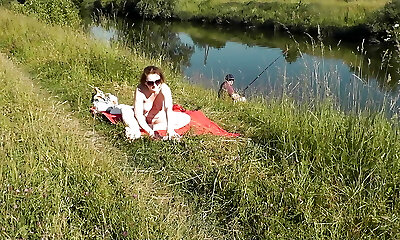 Nudist beach. Public nudity. Fabulous MILF sans undies and bra sunbathes naked is not shy about fisherman. Naked in public. Milf